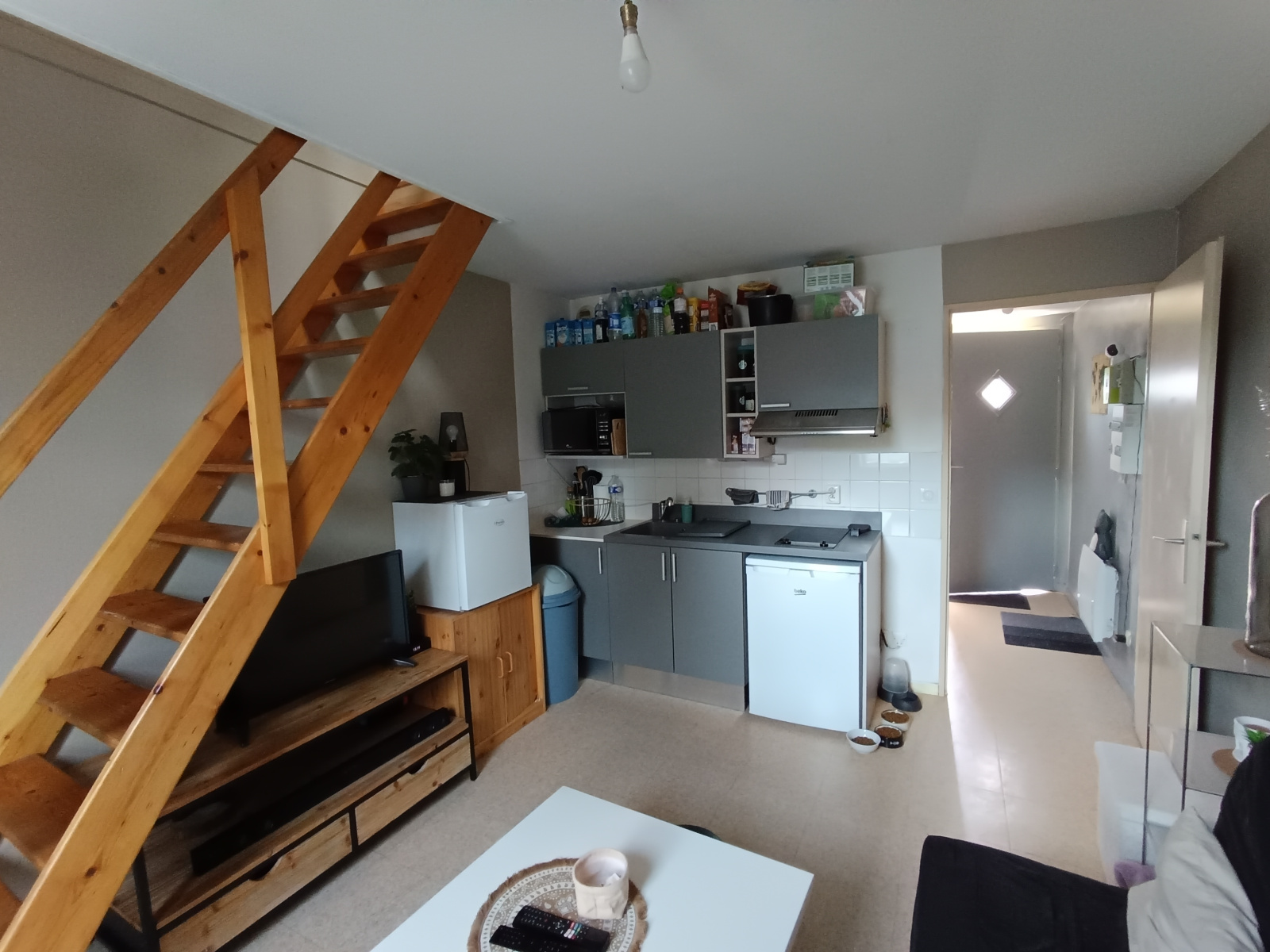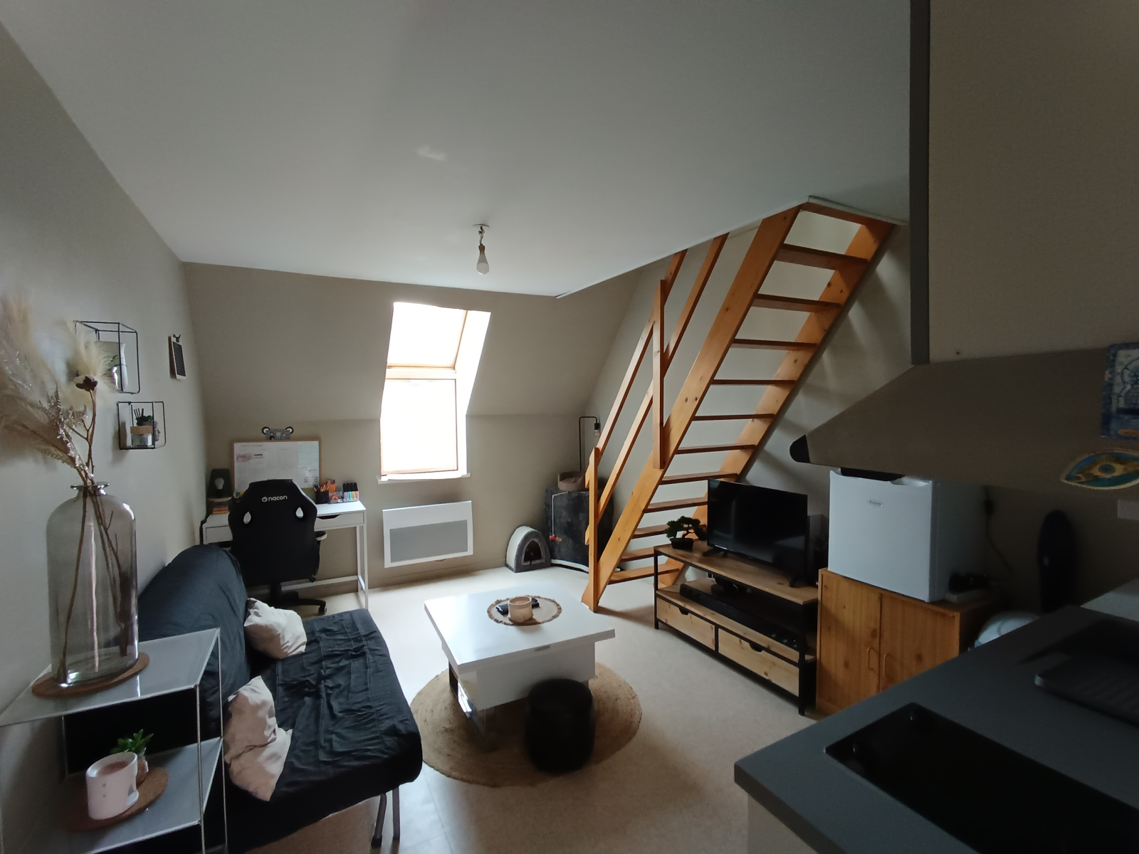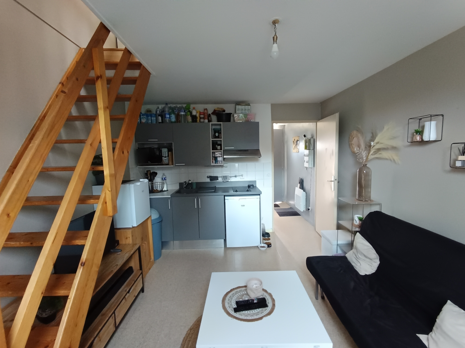 L'appartement comprend entrée pièce à vivre avec cuisine aménagée et équipée, une salle d'eau avec wc, une chambre avec de beaux volumes en mezzanine.